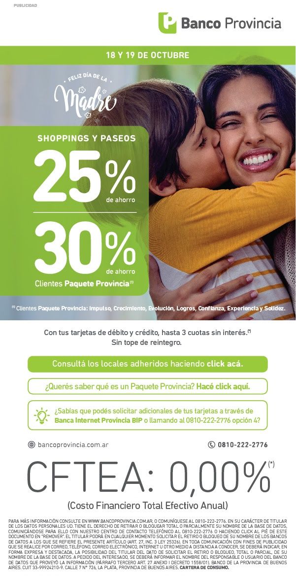 El viernes 18 y sábado 19 hasta 30% de ahorro y 3 cuotas sin interés para quienes abonen sus compras con tarjetas de crédito y débito del Banco Provincia en los locales adheridos de los shopping y paseos participantes, sin tope de reintegro.