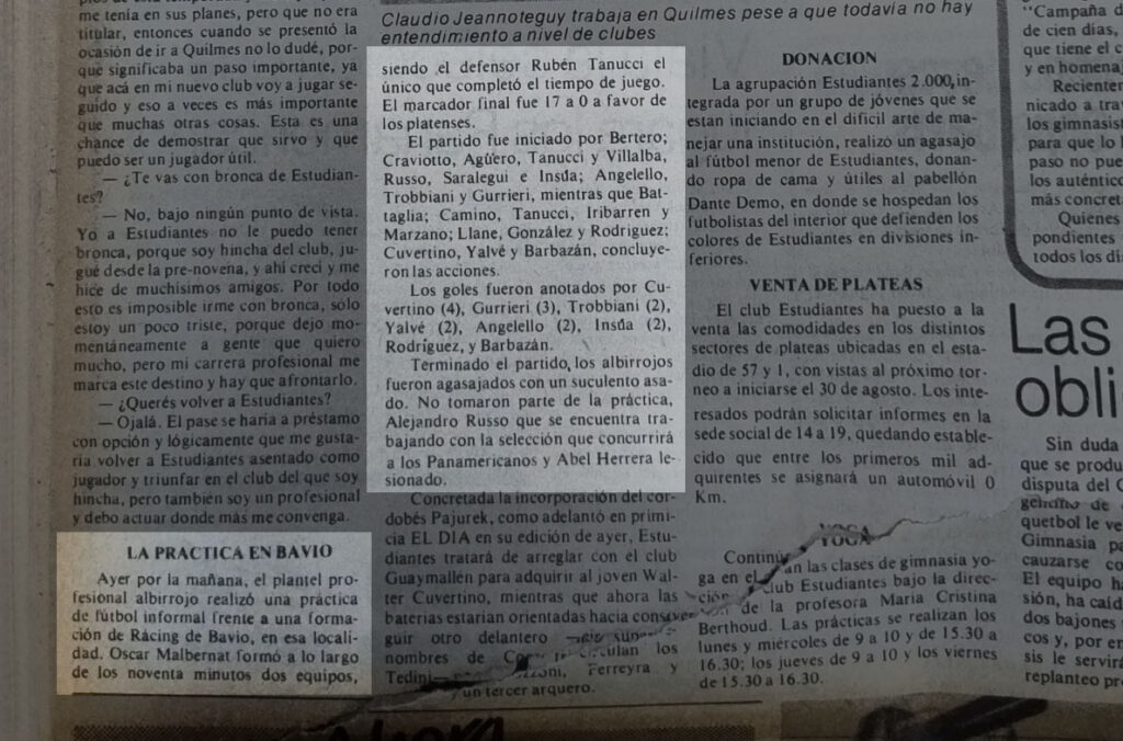 “Ayer por la mañana, el plantel profesional albirrojo realizó una práctica de fútbol informal frente a una formación de Racing de Bavio. (…) El marcador final fue 17 a 0 a favor de los platenses”, confirma la nota publicada por el matutino platense en aquella fecha.