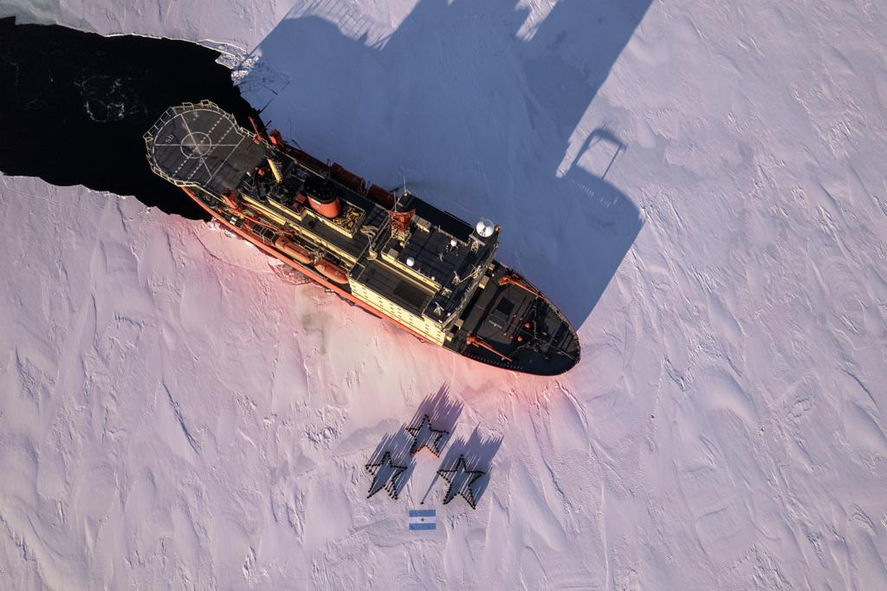 Con un fondo totalmente blanco de hielo que parece inagotable, la tripulación del Rompehielos Almirante Irizar homenajeó a la Selección Argentina al formarse de manera tal que desde las alturas se pudieran ver tres enormes estrellas.