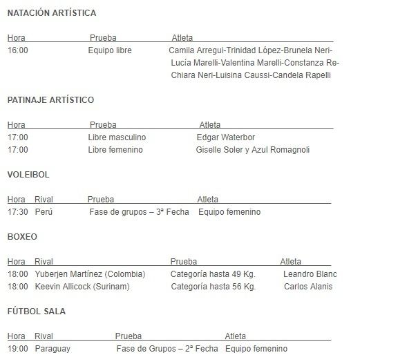 Con representación en 19 disciplinas, la delegación Nacional tendrá una jornada con muchas posibilidades para sumar medallas y así competir con Chile y Venezuela por el tercer y cuarto puesto del medallero, en el tramo final de la competencia.