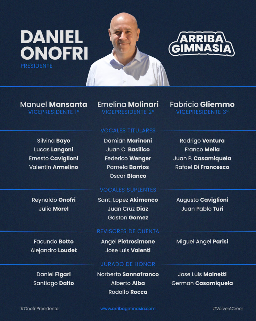 Este lunes por la mañana quedó efectivizada la lista de Arriba Gimnasia, la agrupación que impulsa el regreso a la presidencia de Daniel Onofri, que ya tuvo su experiencia como presidente hace una década.