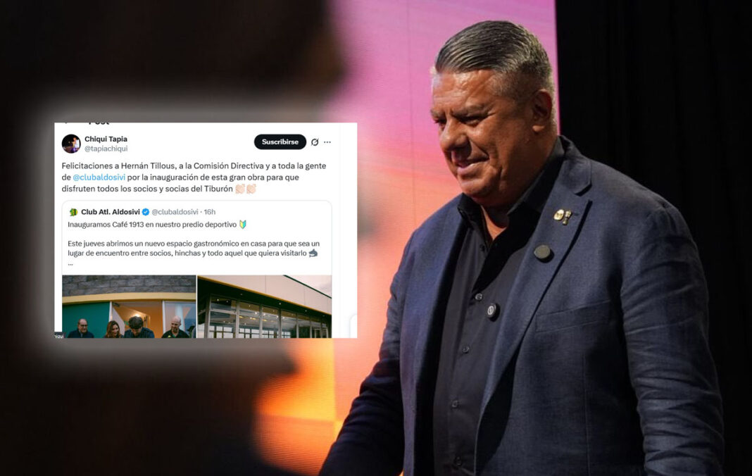 “Felicitaciones a Hernán Tillous, a la Comisión Directiva y a toda la gente de Aldosivi por la inauguración de esta gran obra para que la disfruten todos los socios y socias del Tiburón”, subió Tapia a su cuenta oficial de Twitter, arrobando al presidente de Aldosivi.