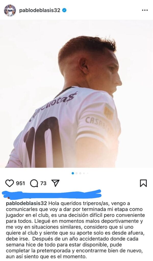 “Hola queridos triperos/as, vengo a comunicarles que voy a dar por terminada mi etapa como jugador en el club, es una decisión difícil pero conveniente para todos. Llegué en momentos malos deportivamente y me voy en situaciones similares, considero que si uno quiere al club y siente que su aporte solo es desde afuera, debe irse. Después de un año accidentado donde cada semana hice de todo para estar disponible, pude completar la pretemporada y encontrarme bien de nuevo, aun así siento que es el momento.