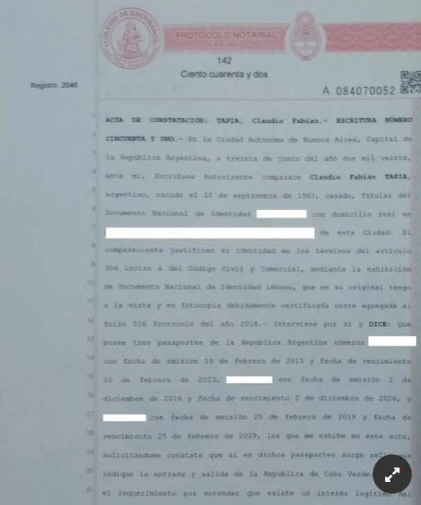 En dicho documento, publicado por Olé, figura que, en la fecha denunciada, el dirigente no ingresó nunca a Cabo Verde, tal cual figura en los tres pasaportes argentinos presentados (los que tiene en su poder, todos con validez) pretendiendo demostrar que ninguno de ellos tenía sello de entrada ni de salida en la colonia portuguesa en África