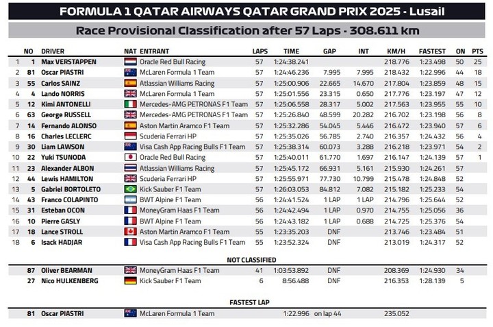 En cuanto al campeonato de pilotos, la victoria de Verstappen le puso suspenso a la definición y lo llevó a la última fecha, dentro de una semana, en Abu Dhabi. Primero, con su triunfo, Max evitó que Lando Norris, con McLaren, se consagrara en Qatar. Y después, por la mala estrategia de esa escudería, logró descontarle 13 puntos y quedar a solo 12 unidades, con 25 en juego. El otro que también tiene chances de campeonar es Oscar Piastri, que salió segundo y mantiene su ilusión de coronar en el final.