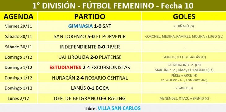 En tanto Estudiantes no tuvo la misma suerte que su rival de toda la vida, ya que las Leonas cayeron como locales en City Bell por un sorpresivo 4-2 ante Excursionistas, a pesar de ir ganando por 2-1. Los dos goles fueron de Antonela Guarracino.