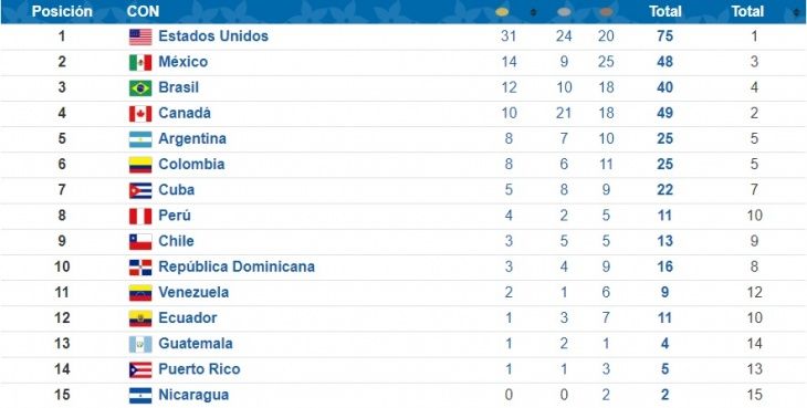 Con la misma cantidad de medallas aparece Colombia, uno de los competidores directos en estos Juegos Panamericanos. Por encima de Argentina se ubican: Estados Unidos (75), México (48), Brasil (40) y Canadá (49).