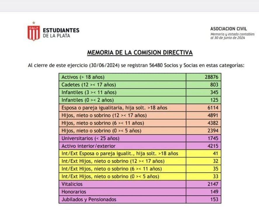 Estudiantes dio a conocer los números de la Memoria y Balance del último año para que los socios del club lleguen bien informados a la Asamblea Ordinaria que se celebrará el próximo sábado 19 de octubre. Más allá de los datos deportivos y económicos, el ítem que nuclea a los socios es uno de los más destacados del informe.