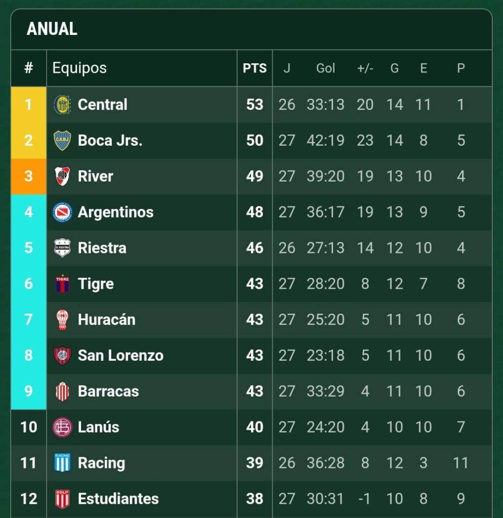 Estudiantes marcha decimosegundo en la tabla general con 38 puntos y quedó a cinco de la clasificación a Sudamericana, que hoy es propiedad de Barracas Central que tiene 43 unidades. Entre ellos se ubican Lanús (40) y Racing (39).