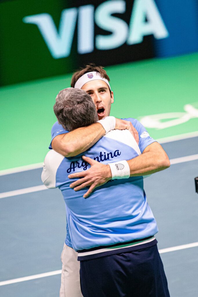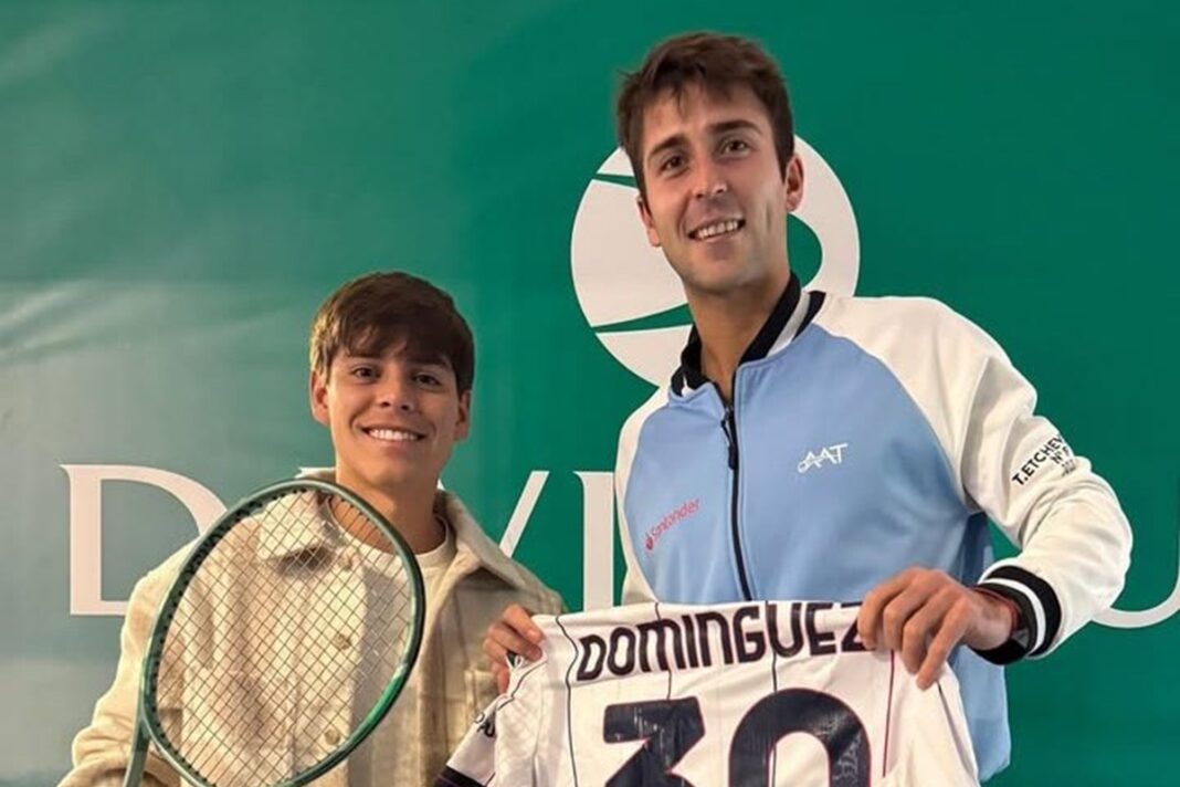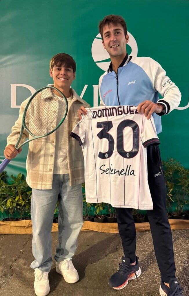 Tras esa primera alegría a nivel nacional, Benja y Tomy se encontraron en zona de vestuarios, donde hubo abrazo, charla, foto y un intercambio que dio que hablar en los hinchas del Mens Sana. Por el lado del futbolista, con la raqueta que supo usar el tenista. Y por el lado de Etcheverry, con la “30” de Domínguez del Bolonia.