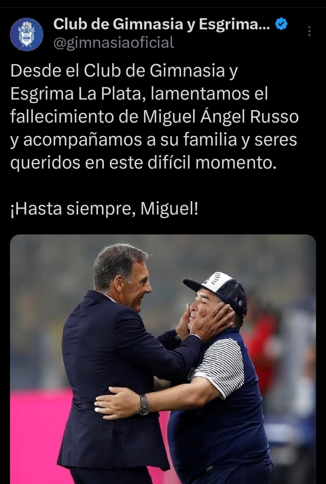 La AFA también publicó unas líneas. “La Asociación del Fútbol Argentino, a través de su Presidente Claudio Tapia, lamenta profundamente el fallecimiento de Miguel Ángel Russo y envía su más cálido abrazo a familiares y seres queridos.“