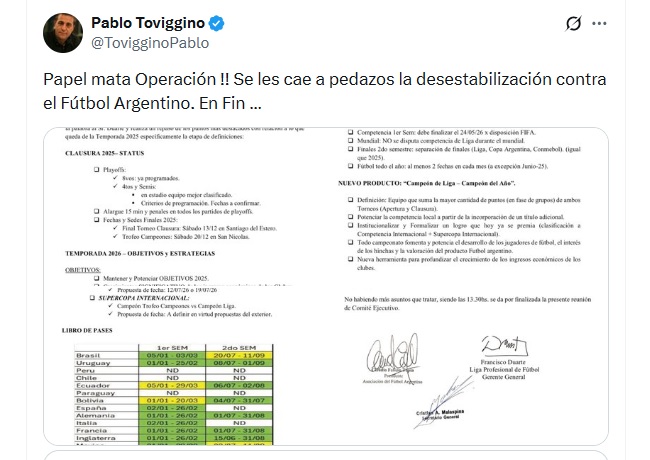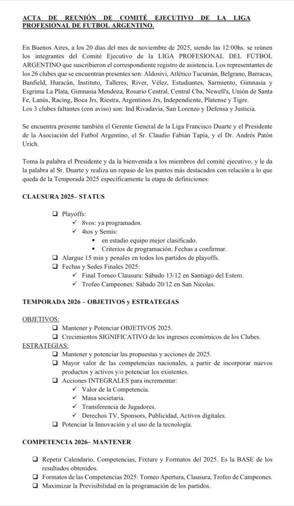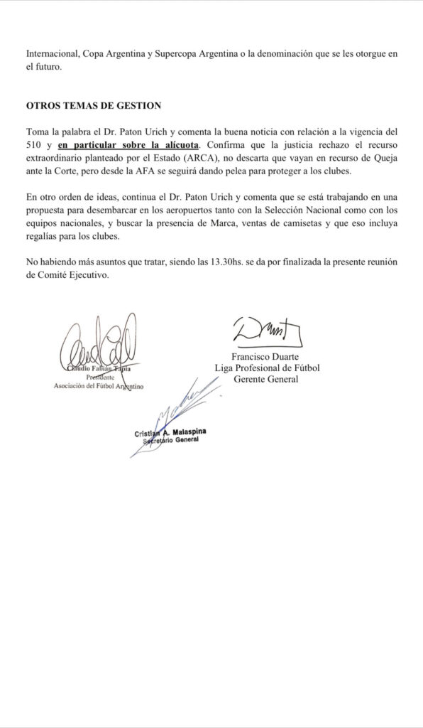 Por último, también, otro fallido de AFA tiene que ver con las firmas. Se dijo en un primer momento que en el acta en cuestión estaba la firma de Pascual Caiella, pero lo que fue dado a conocer es bien distinto: solamente lleva el gancho del propio Tapia, de Francisco Duarte (Gerente General de Liga Profesional) y de Cristian Malaspina (Secretario General).