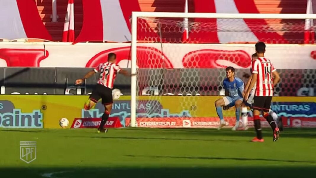 A 10 minutos del final, y tras un rebote en el área del equipo Tripero, la pelota le quedó picando delante de su posición a Leandro Díaz, en el área chica y con el arquero a merced del destino. El delantero saco un zurdazo desde abajo y fuerte, la pelota pegó en el travesaño y se fue a la tribuna.