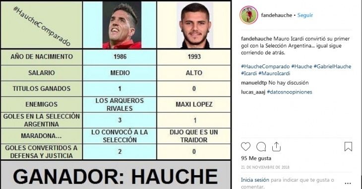 Por su parte twitter tuvo un protagonista estelar anoche “El fan de Hauche”. La cuenta es de un “admirador del futbolista argentino Gabriel Hauche” le da un seguimiento minucioso a la carrera del delantero con datos y estadísticas tan entretenidas como reales.