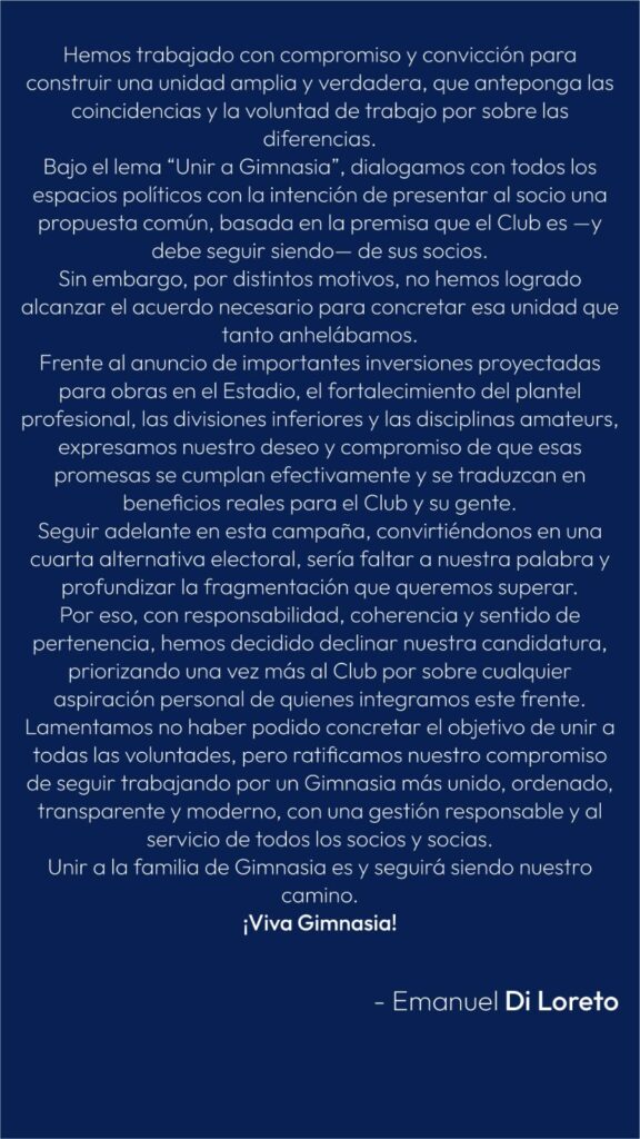 “Bajo el lema Unir a Gimnasia, dialogamos con todos los espacios políticos con la intención de presentar al socio una propuesta común, basada en la premisa que el Club es —y debe seguir siendo— de sus socios. Sin embargo, por distintos motivos, no hemos logrado alcanzar el acuerdo necesario para concretar esa unidad que tanto anhelábamos”, reza la primera parte del comunicado.