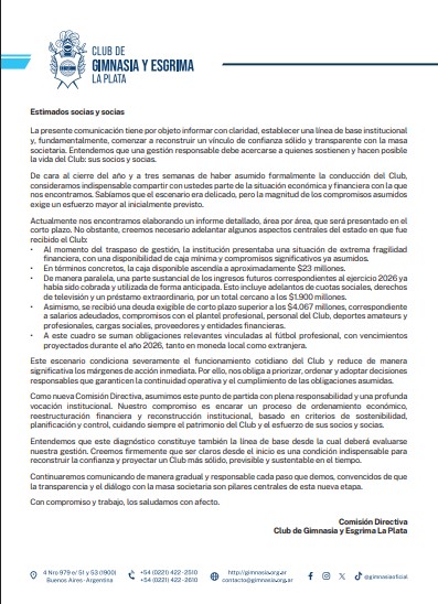 La presente comunicación tiene por objeto informar con claridad, establecer una línea de base institucional y, fundamentalmente, comenzar a reconstruir un vínculo de confianza sólido y transparente con la masa societaria. Entendemos que una gestión responsable debe acercarse a quienes sostienen y hacen posible la vida del Club: sus socios y socias.