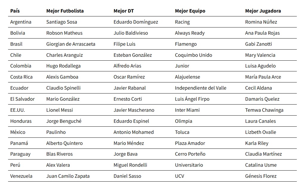 Si bien no se especificaron la cantidad de votos para cada vencedor, Eduardo Domínguez fue elegido como el mejor DT del fútbol argentino, mientras que Filipe Luis ganó como el mejor DT del continente. En tanto el mejor jugador argentino fue Santiago Sosa, el mejor equipo Racing y la mejor jugadora Romina Núñez.