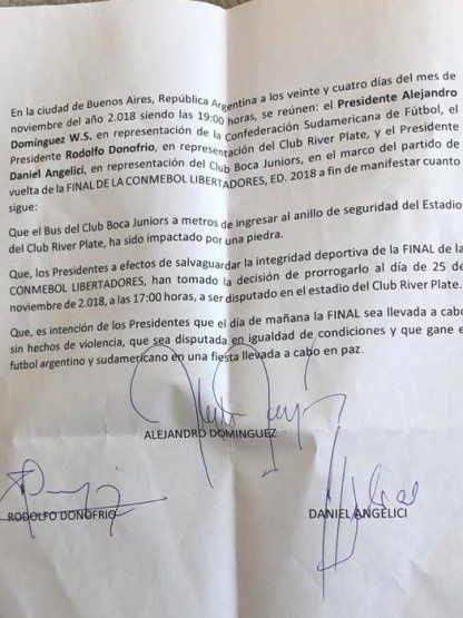 En un sábado negro y para el olvido en el fútbol argentino y sudamericano y tras dos postergaciones por parte de la Conmebol, que quería bajo la presión de FIFA jugar el partido, se llegó a un acuerdo entre todas las partes.