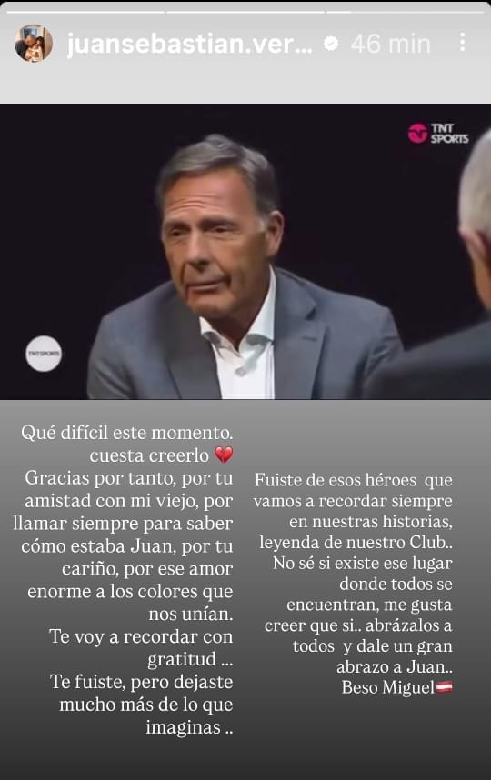 Y siguió: “Fuiste de esos héroes que vamos a recordar siempre en nuestras historias, leyenda de nuestro Club. No sé si existe ese lugar donde todos se encuentran, me gusta creer que sí… Abrazalos a todos y dale un gran abrazo a Juan. Beso, Miguel”.
