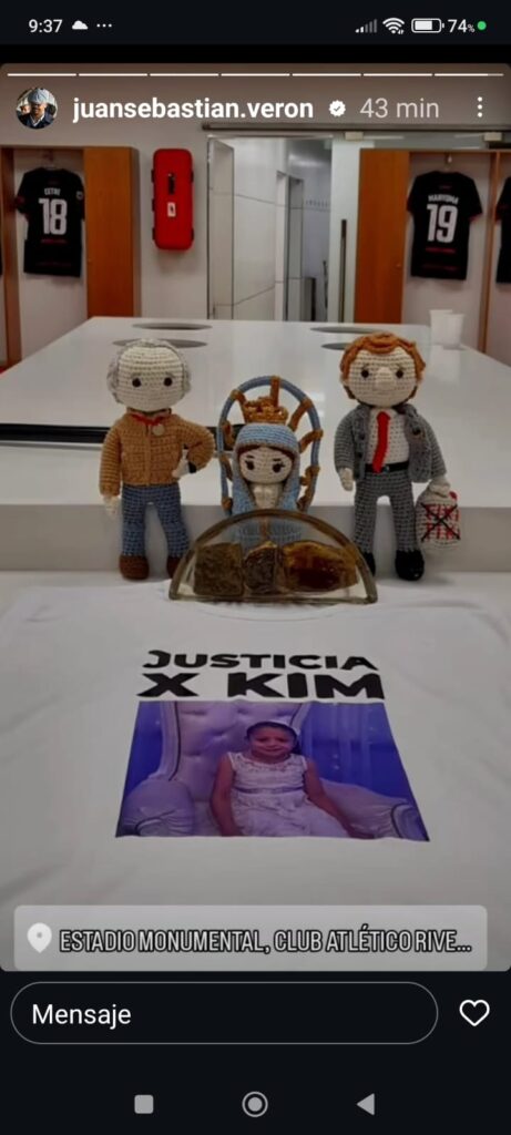 Este domingo a primera hora, el presidente Verón felicitó a los jugadores por la victoria reposteando un video de celebración y posteriormente subió a su instagram personal una foto del vestuario una foto con unos muñecos tejidos de Sabella, Bilardo y la Virgen María con una foto de la nena asesinada y la leyenda “Justicia por Kim”.