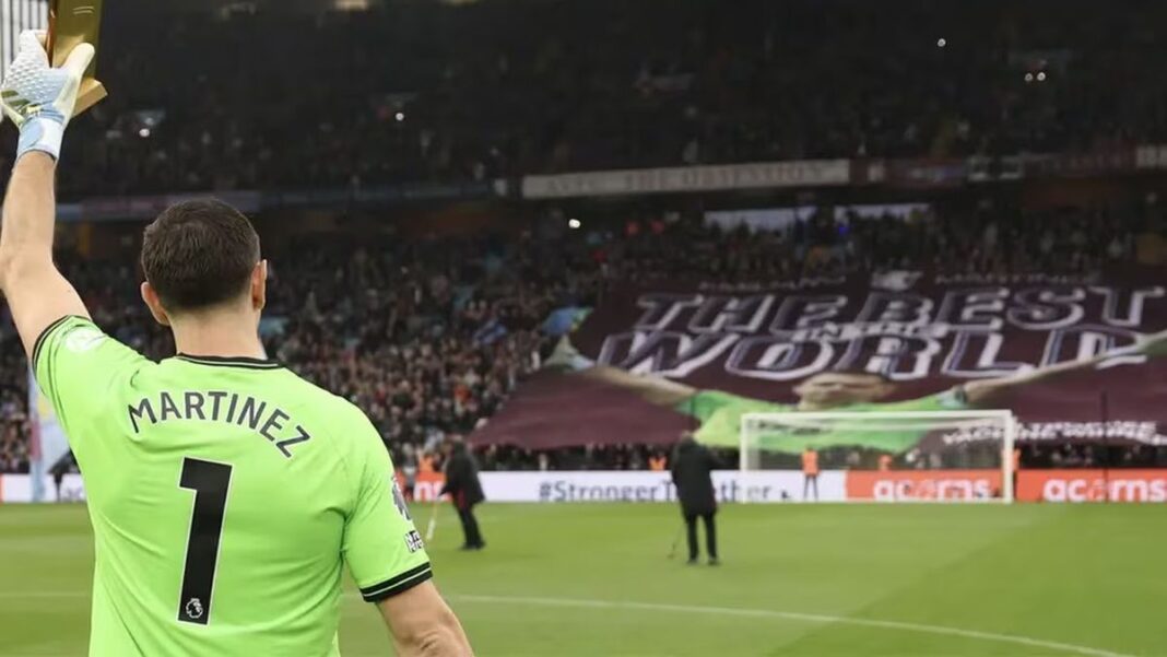Emiliano Dibu Martínez se quedó con todos los flashes en una nueva jornada de Champions League. El arquero de la Selección se presentó en el estadio de su Aston Villa de la mano de sus hijos luciendo sus dos guantes de oro por ser el mejor arquero del mundo en 2023 y 2024 y fue recibido como un ídolo.