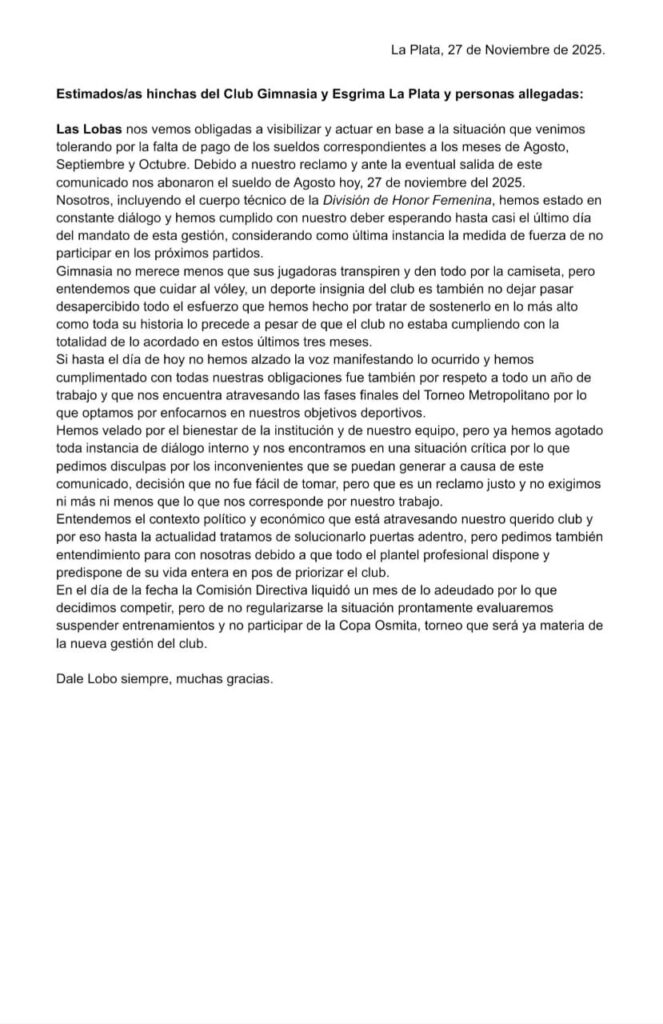El plantel y el cuerpo técnico de Las Lobas explicaron que durante meses mantuvieron el diálogo interno, cumpliendo con todas sus obligaciones profesionales pese al atraso salarial y priorizando los compromisos deportivos del equipo. Sin embargo, aseguraron que la situación llegó a un límite, especialmente en un contexto en el que Gimnasia afronta las fases finales del Torneo Metropolitano.
