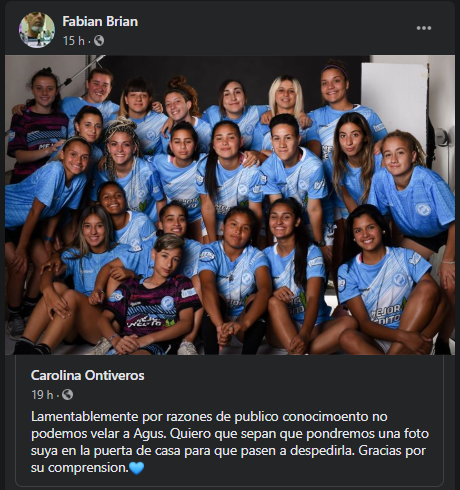 El padre de la juvenil arquera, Fabián, escribió una carta de despedida en la red social Facebook: “Al final nos dejaste con solo 19 años, siempre con tu buena onda y una sonrisa en tu cara, te hiciste querer por mucha gente que rezó por vos, pero ahora estás en paz, descansando de todo lo que pasaste en tus 19 años. Te amo, te amamos, aunque nos hayas dejado siempre estarás con nosotros”, señaló.