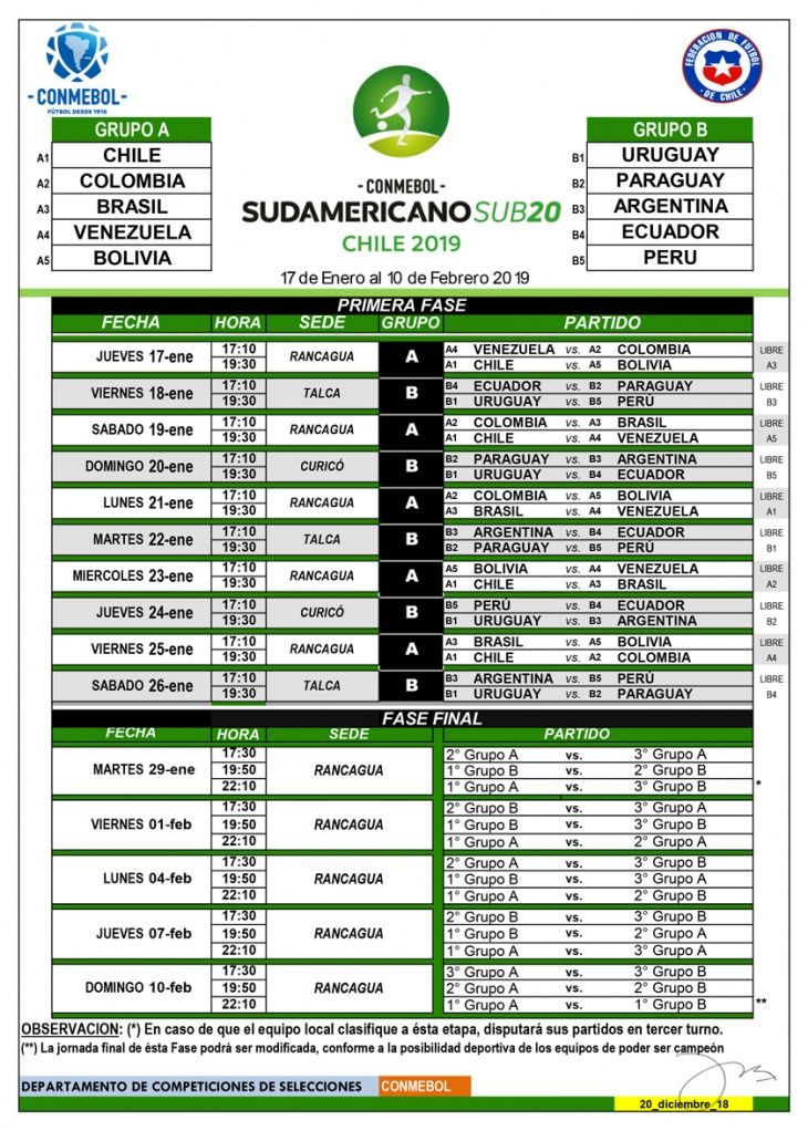 Por su parte en el Grupo B, que será el que contará con los representantes nacionales, los partidos comenzarán mañana: Ecuador vs. Paraguay (17:10) y Uruguay vs. Perú (19:30), ambos en el Estadio Fiscal de la ciudad de Talca.