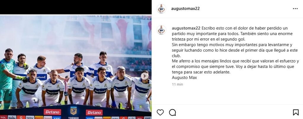 “Escribo esto con el dolor de haber perdido un partido muy importante para todos. También siento una enorme tristeza por mi error en el segundo gol“, arrancó su posteo Augusto Max, el día después de la derrota de Gimnasia en el Clásico Platense.