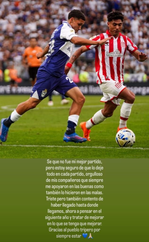 Jeremías Merlo escribió en su cuenta de Instagram: “Sé que no fue mi mejor partido, pero estoy seguro de que lo dejé todo en cada partido, orgulloso de mis compañeros que siempre me apoyaron en las buenas como también lo hicieron en las malas. Triste pero también contento de haber llegado hasta donde llegamos, ahora a pensar en el siguiente año y tratar de mejorar en lo que se tenga que mejorar. Gracias al pueblo tripero por siempre estar”.