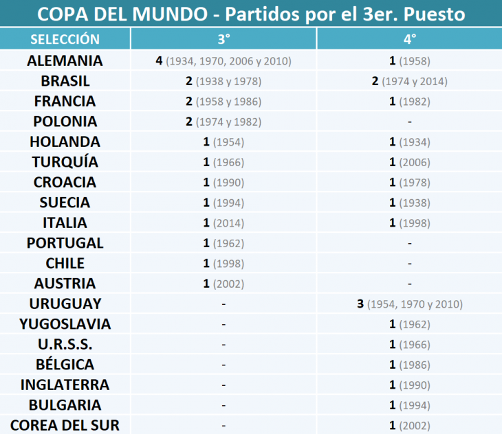 El de hoy será el partido número 19 en el que se pondrá en juego el tercer puesto de una Copa del Mundo. ¿Por qué? Porque si bien es la edición mundialista N° 21 en 1930 y en 1950 no se disputó un encuentro de esas características.