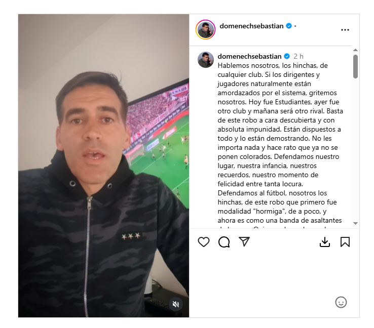 Asimismo, en el video de poco más de un minuto, Domenech amplió su queja. “Mirá que en el laburo me toca cubrir grandes robos, impresionantes, pero como este no va haber…”, dijo mientras se quitaba una campera y dejaba a la vista su camiseta de Estudiantes. Al mismo tiempo, de fondo, una tele mostraba el resumen del partido.
