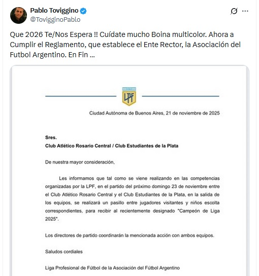 El posteo remite directamente a lo ocurrido tiempo atrás, cuando Estudiantes fue obligado a hacerle pasillo a Rosario Central, campeón en una definición polémica. En aquel episodio, Toviggino había salido al cruce con frases provocadoras, entre ellas el recordado “y aplaudan con ganas” de su compinche Maxi Leavy, presidente de Almirante Brown, acompañado de mensajes ofensivos hacia Verón.