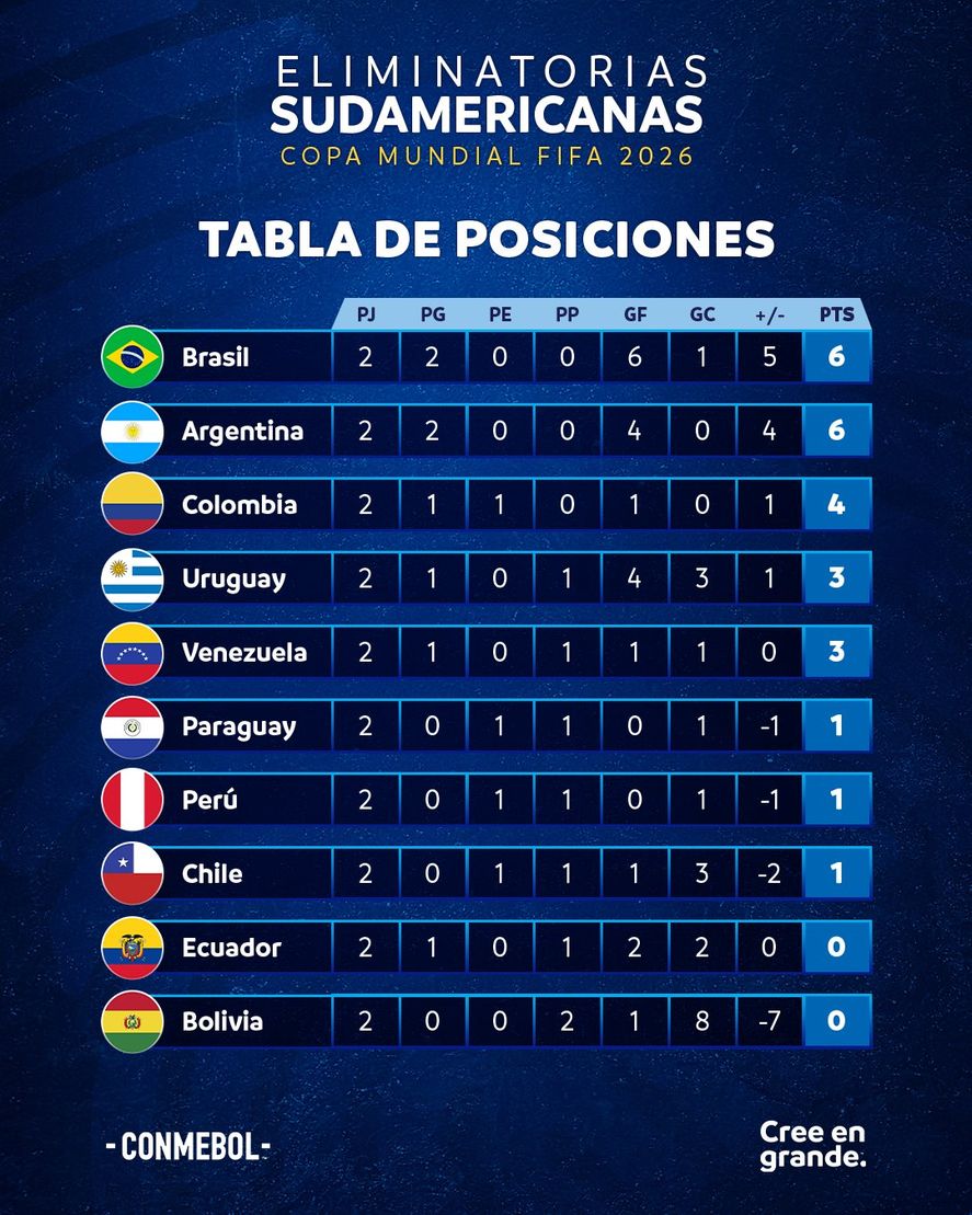 Argentina ganó sus dos partidos en el arranque de las Eliminatorias pero no es líder de la competencia. Mirá quién manda y todos los goles de la fecha 2.