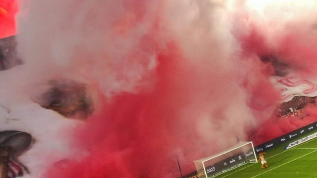 El plantel de Estudiantes saltó al campo de juego del estadio UNO, para jugar ante Talleres, y los hinchas lo recibieron con muchos telones, humo y mucho color.