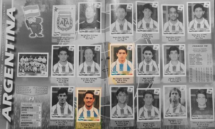 En Francia el DT fue Daniel Passarella, y de cara al Mundial dejó afuera a dos futbolistas de los 16 que fueron parte del álbum de la primera edición con 32 equipos. Uno fue Hernán Díaz, alguien a quien conocía bien de River, y el otro un joven Juan Román Riquelme de 19 años.