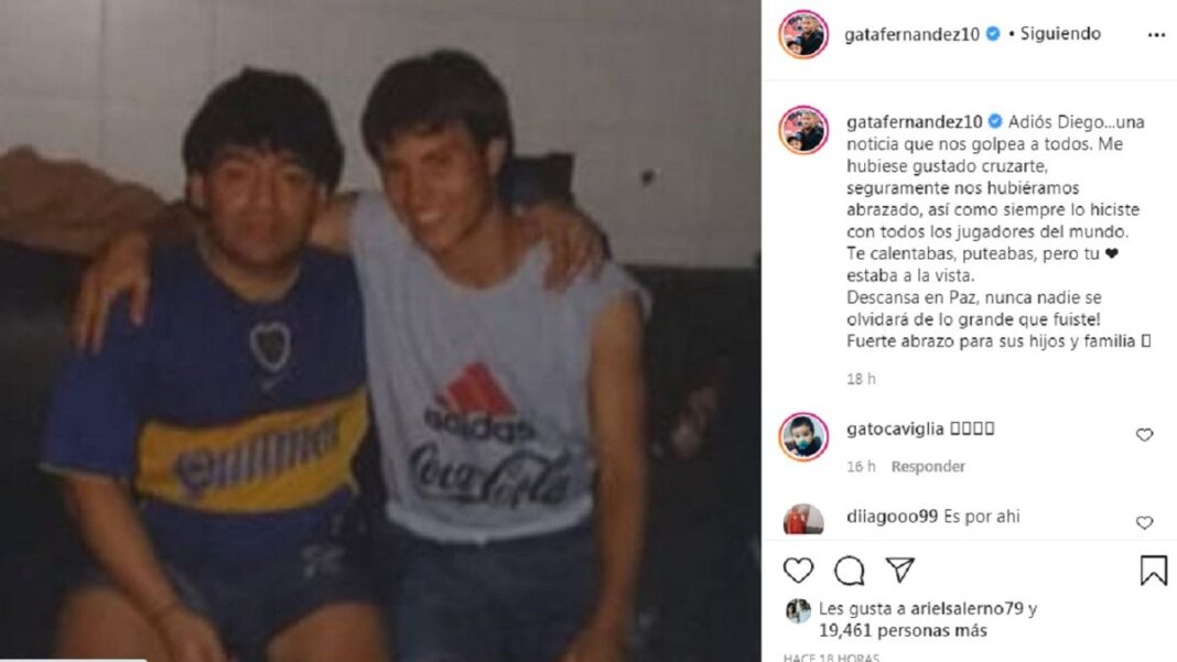 Uno de los que utilizó su cuenta de Instagram para despedirlo fue la Gata Fernández. A través de una imagen juntos, donde la Gata era chico y Diego Maradona luce la camiseta de Boca, el ex futbolista de Estudiantes escribió un emotivo mensaje, recordando su figura como jugador y su personalidad.