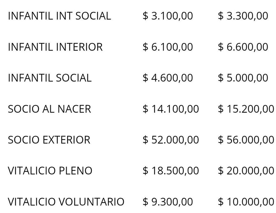 El nuevo ajuste implica un incremento del 8% respecto a los valores vigentes, por lo que la categoría socio pleno pasará de $18.500 a $20.000 mensuales. Asimismo, se detallaron los valores actualizados para las demás categorías, que incluyen grupos familiares, cadetes, infantiles y vitalicios.