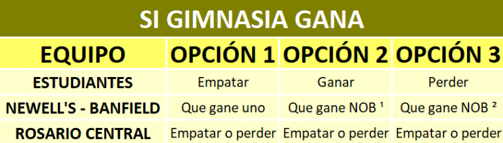 En este último caso el 16° sería Gimnasia y el 17° pasaría a ser Estudiantes. En tanto para que el Clásico sea posible, si el Tripero suma de a tres, en todos los escenarios que se puedan plantear se necesita que Rosario Central no gane.