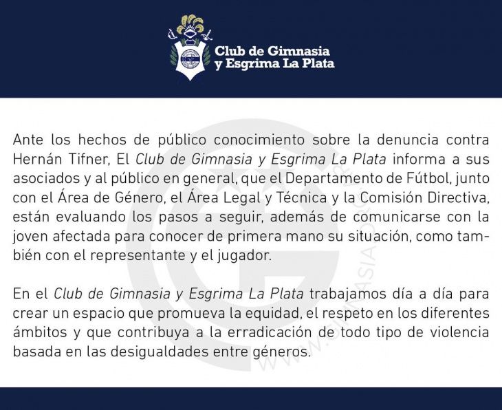“Ante los hechos de público conocimiento sobre la denuncia contra Hernán Tifner, El Club de Gimnasia y Esgrima La Plata informa a sus asociados y al público en general, que el Departamento de Fútbol, junto con el Área de Género, el Área Legal y Técnica y la Comisión Directiva, están evaluando los pasos a seguir, además de comunicarse con la joven afectada para conocer de primera mano su situación, como también con el representante y el jugador”, aclaran desde Gimnasia a través de un comunicado.