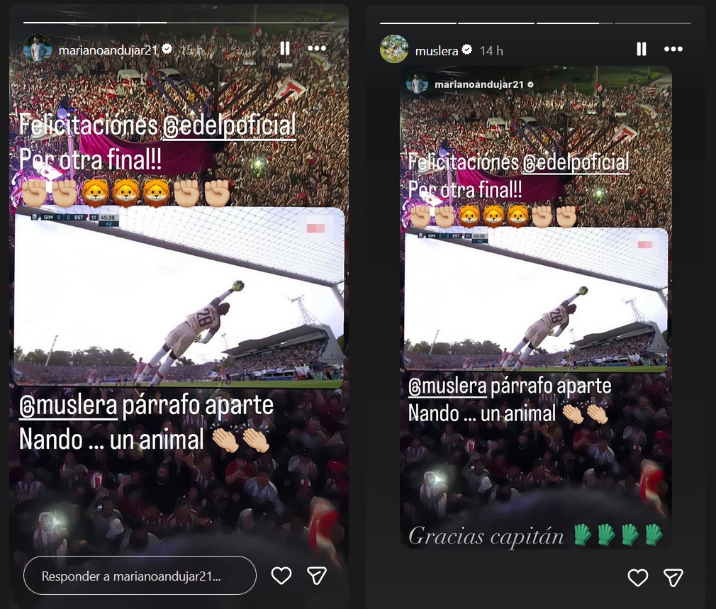 El elogio de Andújar no quedó allí, ya que el actual arquero de Estudiantes no tardó en responder y al rato compartió esa historia en su propia cuenta de Instagran, con un mensaje de agradecimiento: “Gracias capitán”, con varios emojis de guantes.