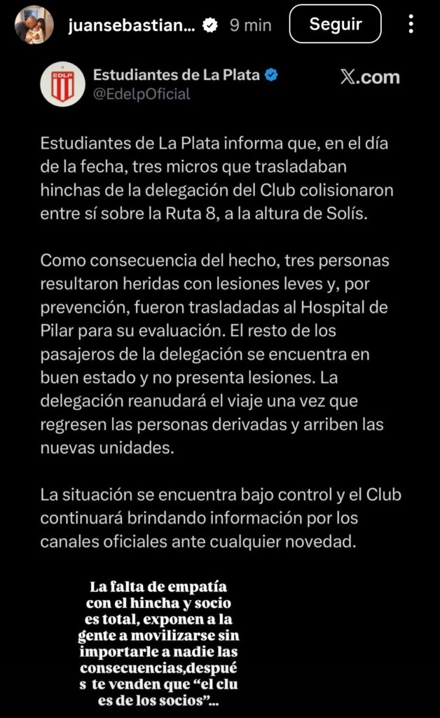 El incidente tuvo lugar cerca de los 2 de la mañana y fue dado a conocer por el club a través de sus redes. Estudiantes emitió un comunicado a las 2:41 de la madrugada en el que dio cuenta de que tres unidades colisionaron entre sí, remarcando que la situación estaba bajo control.