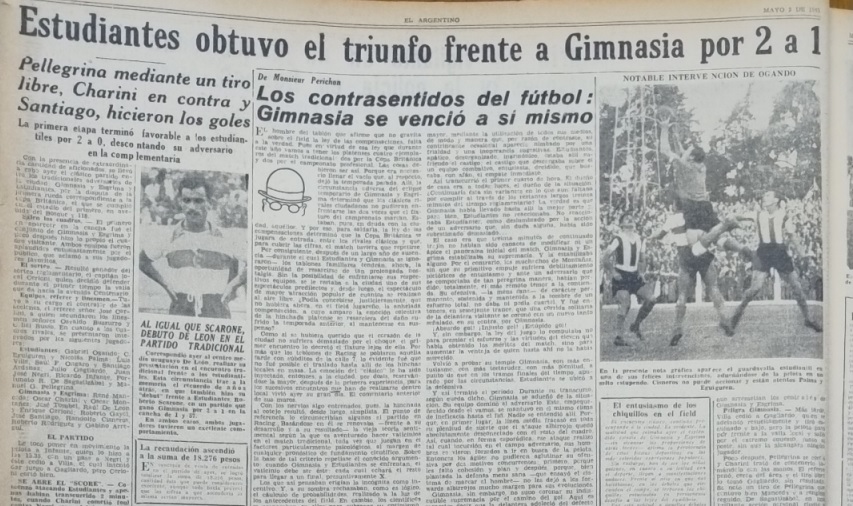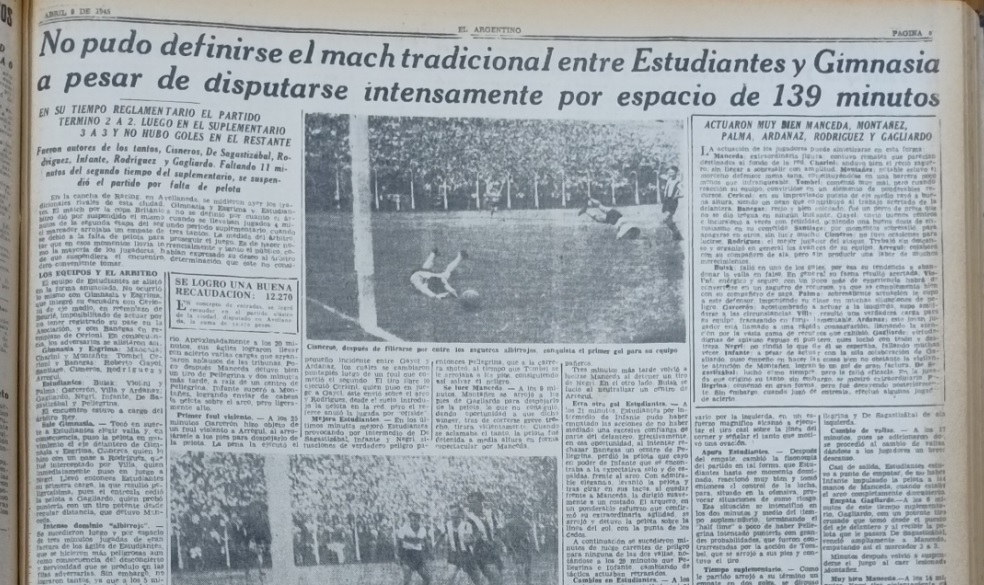 Aquel domingo 8 de abril arrancó dominando Estudiantes, pero el que primero convirtió fue Gimnasia. Randolfo Cisneros se sacó dos rivales de encima antes de los 10’ y con un remate cruzado abrió el score. Fortunato De Sagastizábal lo empató rápido, tras una buena maniobra personal, eludiendo rivales desde el córner.