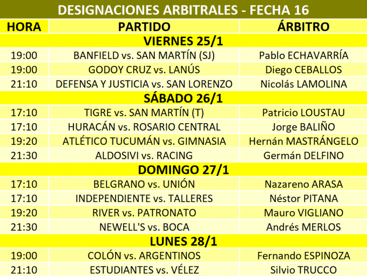 La Superliga Argentina de Fútbol arrancará nuevamente desde este viernes, y por eso en las últimas horas se dieron a conocer las designaciones para los 13 partidos que se estarán disputando en el marco de la fecha 16.