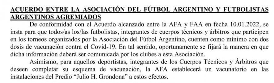 De conformidad con el Acuerdo alcanzado entre la AFA y FAA en fecha 10.01.2022, se insta para que todos/as los/las futbolistas, integrantes de cuerpos técnicos y árbitros que participen en los torneos organizados por la Asociación del Fútbol Argentino, cuenten como mínimo con dos dosis de vacunación contra el Covid-19. En tal sentido, oportunamente se fijará la manera en que dicha información deberá ser comunicada por los clubes a esta Asociación.