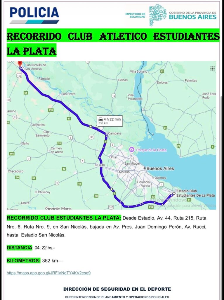 Los organismos de seguridad dieron a conocer los detalles del operativo en el que hay un dato sustancial. Los hinchas de Estudiantes deberán hacer un viaje mucho más largo que el habitual, ya que deberán bordear la ciudad de Buenos Aires. en su comunicado, Aprevide explica que “la parcialidad de ESTUDIANTES L.P hará lo propio saliendo desde el Estadio “Uno” tomando Av. 44 hasta Ruta N° 06, luego Ruta Nro. 9, en San Nicolás, bajada en Av. Pres. Juan Domingo Perón hacia Av. Rucci. Ocuparán la tribuna Popular Reynoso, Platea Rucci y en un sector de la Platea del Pozo”.