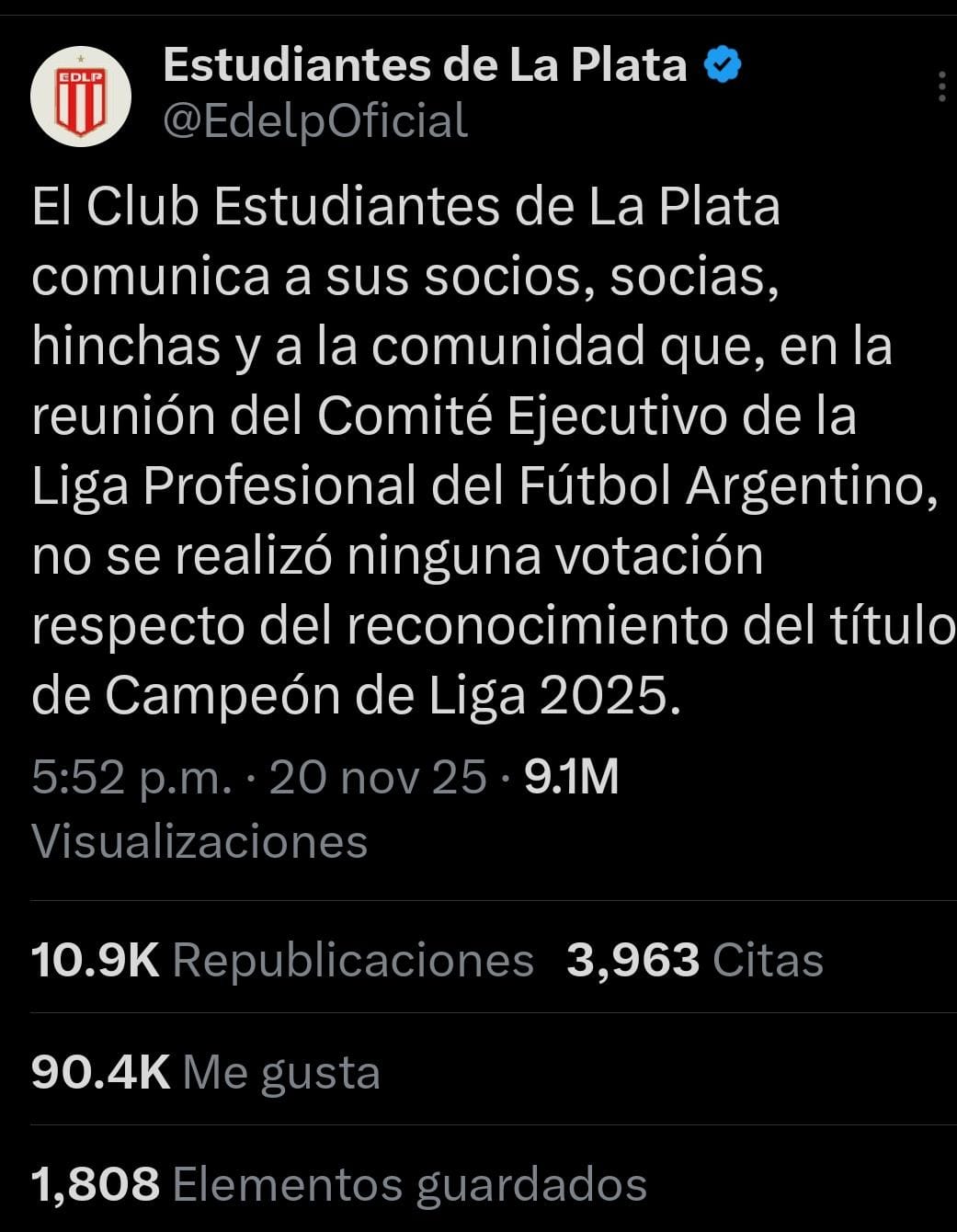 El reciente posteo de Estudiantes en su cuenta oficial de X sobre la posición del club en torno al título que la AFA le dio a Rosario Central no solo buscó aclarar su posición institucional, sino que se convirtió en un fenómeno digital. El mensaje, donde el club remarcó que en la reunión del Comité Ejecutivo de la Liga Profesional “no se realizó ninguna votación” respecto del reconocimiento del título de Liga 2025, prendió rápidamente en redes y puso al Pincha en el centro de la conversación pública.