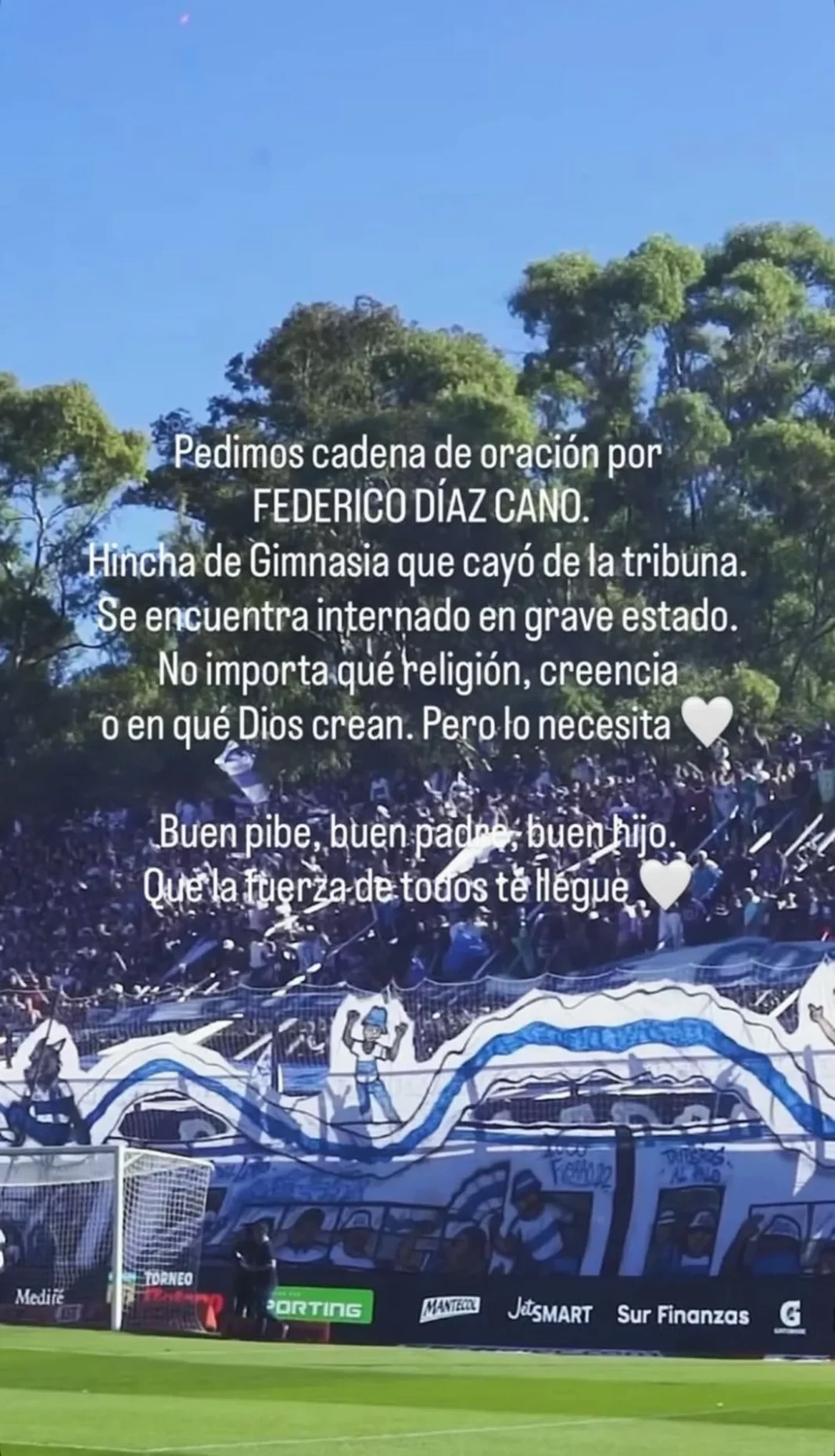 El hincha de Gimnasia que sufrió este lunes en la previa del encuentro entre el Lobo y Estudiantes la caída al vacío desde la tribuna Centenario, cuando la bandera de la cual estaba sujetado cedió, fue identificado como Federico Díaz Cano. Tras el golpe fue rápidamente asistido y trasladado al Hospital San Martín. El simpatizante tripero sufrió múltiples fracturas pero se encuentra estable.