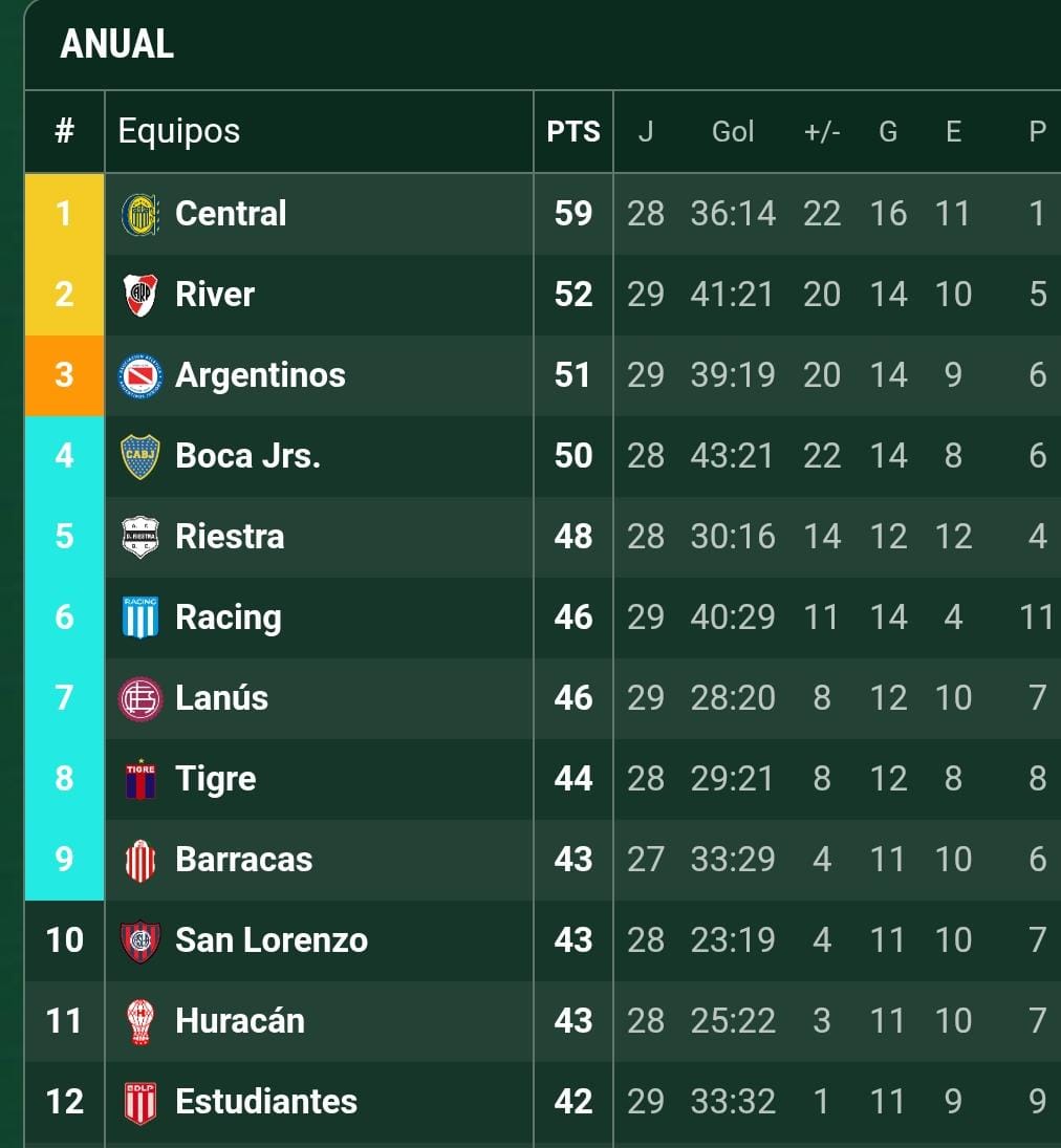 Y en esa carrera, el Pincha quedó a uno, con algunos matices. El último clasificado es Barracas con 43 (y dos partidos menos), un punto más de los que acumula Estudiantes. El detalle es que entre ambos equipos están Huracán y San Lorenzo, también con 43, pero con un partido menos. Por lo que lo que viene promete ser una pelea fecha a fecha.