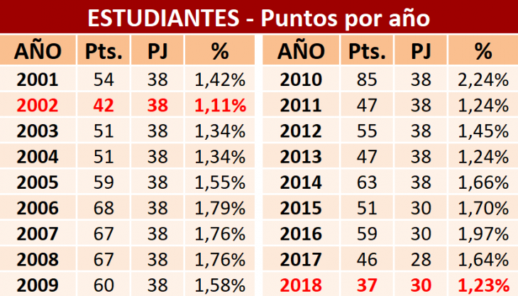 Desde que comenzó el Siglo XXI, del 2001 a esta parte, solamente el 2002 arrojó un peor promedio de puntos sobre partidos disputados: este año arrojó una media de 1,23 punto por encuentro, mientras que aquel, con 42 Pts. en 38 PJ, dio un 1,11.